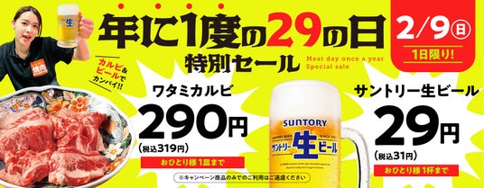 年に一度の「29の日」は気軽にカルビとビールでカンパイ!この機会にぜひおお立ち寄りください。