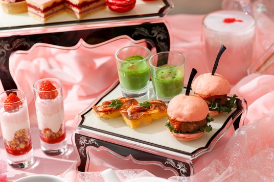 スイーツは、いちごを贅沢にあしらったタルトや、いちご味のモンブラン、もちもちとした求肥と桜チップをのせたホワイトチョコレートムースなど、桃色に真っ赤ないちごが映える7種がラインアップ。セイボリーは、春の新緑をイメージさせるグリーンベジタブルポタージュや桜海老と筍のキッシュ、旨味が凝縮されたピンクバンズのミニバーガーの3種をご用意いたします。