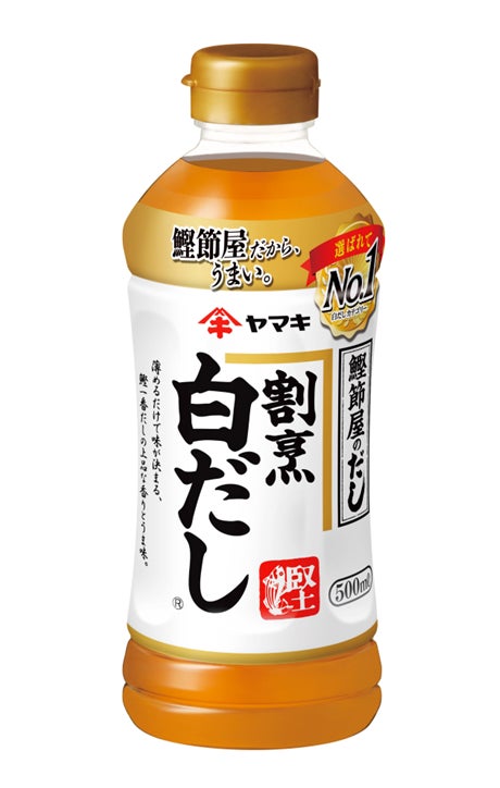 「ヤマキ割烹白だし(R)」は、鰹節屋・だし屋としてのこだわりを活かした、鰹だしの上品な香りとうま味を効かせた万能タイプの液体調味料です。良質なかつお節から抽出しただしにより、濃厚なだし感を実現しており、「だし巻き卵」や「から揚げ」などをジューシーできれいに仕上げることができます。2023年度(2023年4月~2024年3月)の販売金額が前年比114%で着地し、13年連続の伸長となりました。過去最高の販売金額を記録するとともに、ヤマキは当カテゴリーにおいてメーカーシェア率31%(※)を獲得しています。