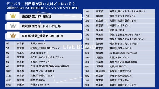 株式会社 LIVE BOARD(本社:東京都渋谷区、代表取締役社長:高木 智広 以下、LIVE BOARD)は、NTTドコモの「docomo Sense(TM)※1(旧名、顧客理解エンジン)」や「docomo data square(R)※2」等を活用し、LIVE BOARD屋外ビジョンにおける分析を実施しています。1月下旬から2月上旬にかけてが1年で最も寒くなる時期といわれています。寒さが厳しくなって外出頻度が減り、デリバリーを利用することが増えたという方もいるのではないでしょうか。そこで今回は、LIVE BOARDネットワークの対象となる全国約110の屋外ビジョンから“デリバリー利用率が高い人”が多いビジョンをランキング化しました。