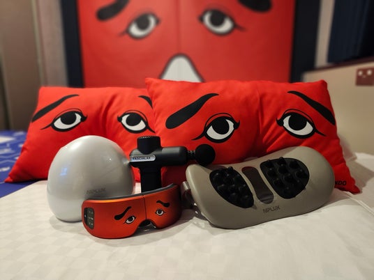 本コラボルームは、福岡銘菓「にわかせんぺい」のユニークな世界観が融合した特別な空間です。NIPLUXからは期間中、人気の美容機器を当客室に多数導入!昨年話題となった「EYE RELAX×にわかせんぺいモデル」も導入され、遊び心あふれるデザインとともに、快適な癒しの時間を提供します。