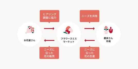 プロジェクトにて実施する月1回のヒアリング調査を通じて、お花屋さんのニーズをヒアリングし、農家さんにつなぐ。花業界の人と人とをつなぐことで、開業して間もないお花屋さんが安心して仕入れることができる環境づくりを目指します。