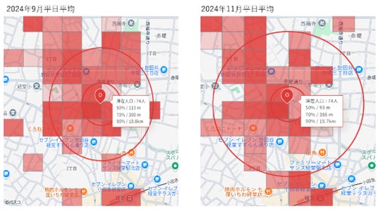 この課題に対して、過去3か月分の月次集計した「人流データ」を活用すると、人流変化を視覚的に確認することができます。出店前後を色で可視化することで、次の出店計画やキャンペーン施策などの検討に役立ちます。