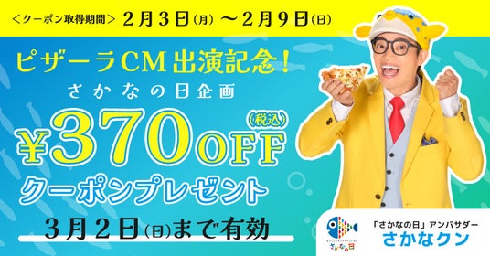 今回ピザーラでは、2月の「さかなの日」にちなんだ特別企画「370円OFFクーポンプレゼント」をピザーラ公式サイトで実施いたします!お得なクーポンは2月3日~9日の期間、ピザーラ公式サイト会員ならどなたでも特設ページより取得できます。