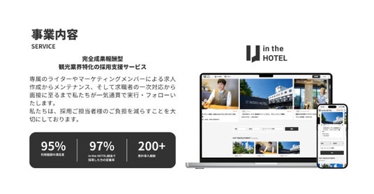 導入施設は大手を含む200施設に達し、 in the HOTEL経由にて採用した応募者の定着率97%、応募者の70%が業界経験者という高い実績を誇っています。