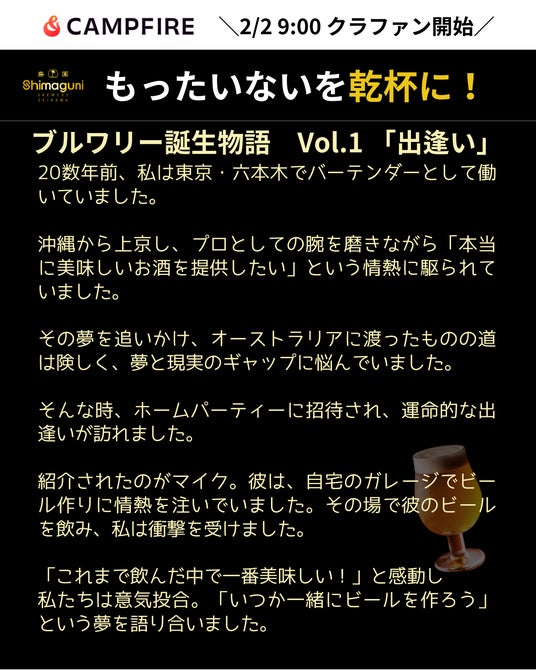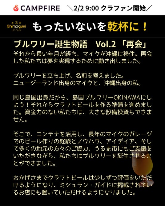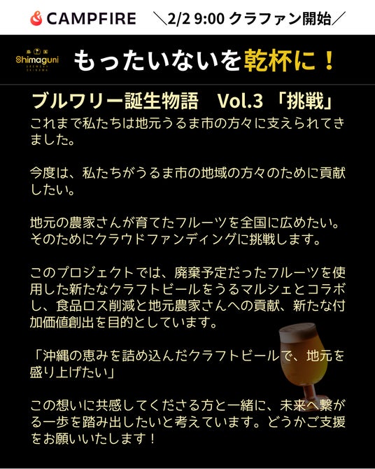 沖縄の恵みを無駄にせず、美味しいビールとして再生するこのプロジェクト。私たちと一緒に「もったいない」を「乾杯」に変える未来を作りませんか?たくさんのご支援をお待ちしています!