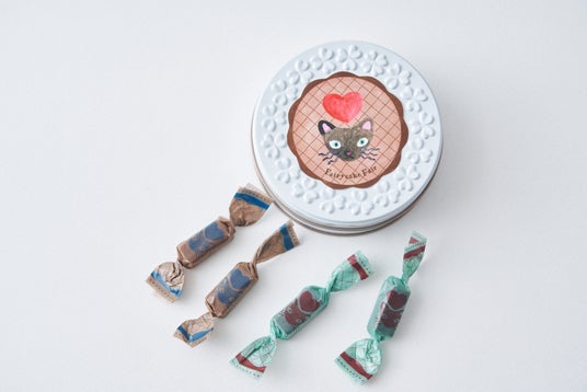 前田ひさえさんが描くかわいらしいネコデザインの缶に、クラフトチョコレートブランド『SOCOLA Lotus to Sakura〈ソコラ・ロータス・ト・サクラ〉』のチョコレートを詰めました。