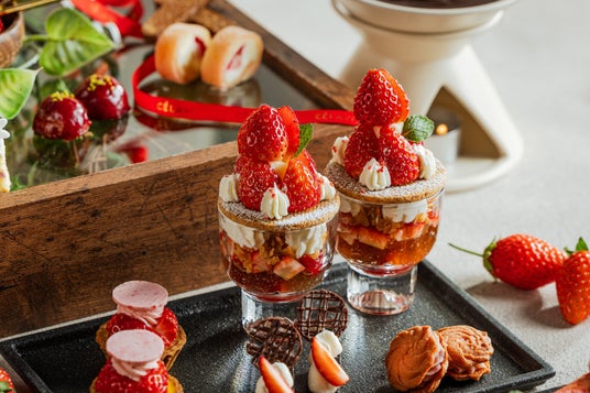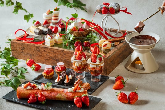 ジューシーな苺の甘みとチョコレートの奥深い味わいが織りなすスイーツの数々を、見た目にも美しく贅沢な味わいを存分に楽しめるラインアップに仕上げました。苺をふんだんに使ったストロベリーパルフェ、カスタードが隠し味の苺大福、バジルとの意外な組み合わせが楽しめる苺とバジルのタルティーヌ、中のとろっとしたチョコクリームがよりしっとり感を引き立たせるフォンダンショコラなど全15種。テーブルで楽しめるチョコレートフォンデュもご用意しており、温かいガナッシュに苺やマシュマロを浸して、ご自分のペースでとろける味わいをお楽しみいただけます。