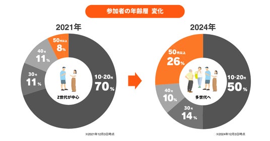 『おてつたび』の50歳以上の参加者は、2021年12月3日時点で全体の8%だったのに対し、2024年12月3日時点では26%に増加しています。