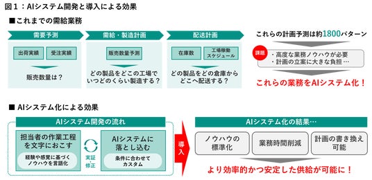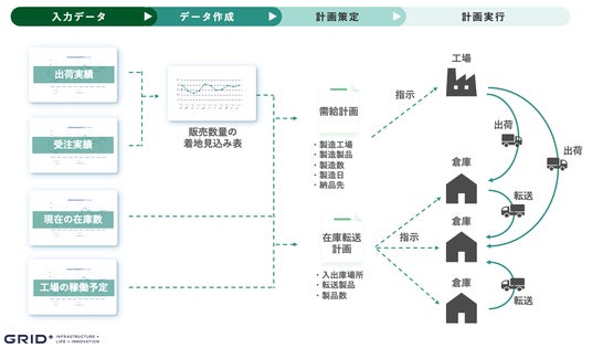 こうした背景の中、当社が培った高度な業務ノウハウと、グリッドのAI技術を組み合わせ、需給管理の自動化システムを開発しました。今回開発したシステムでは、需給計画(製造計画)および在庫転送計画の自動策定が可能となりました。