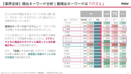 最頻出キーワードは「パフェ」で、ブランド別で評価に大きな差異は見られませんでした。