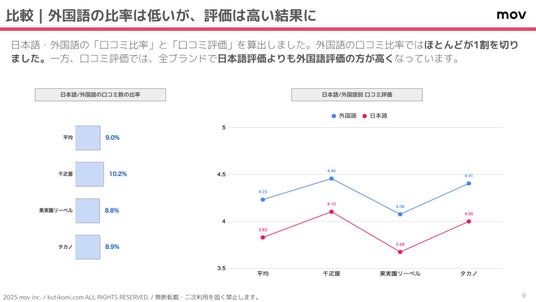 こちらのページでは、日本語・外国語別の「口コミ比率」「口コミ評価(★の数)」を算出しています。外国語の比率は低いものの、全ブランドで日本語評価よりも外国語評価の方が高くなりました。