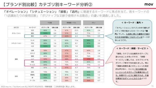 こちらの表では、「オペレーション」「シチュエーション」「接客」「店内」に関連するキーワードに焦点を当て、各キーワードの「1店舗あたりの使用回数」「ポジティブな文脈で使用される割合」の違いを調査しています。