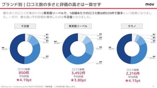 こちらのグラフでは、調査対象3ブランドそれぞれの「口コミ総数」「平均評価(★の数)」「評価内訳」を比較しています。