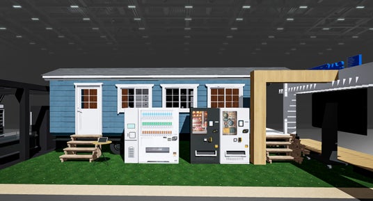 ■トレーラーハウスでの無人販売を想定した提案車両であるトレーラーハウスに自動販売機を搭載し、無人販売が可能な移動型店舗としてパッケージ提案します。移動できるのでスペースを有効活用でき、例えばキャンプ場など、さまざまな立地の新規出店にコストや時間をかけず新たな販売チャネルとして活用できます。