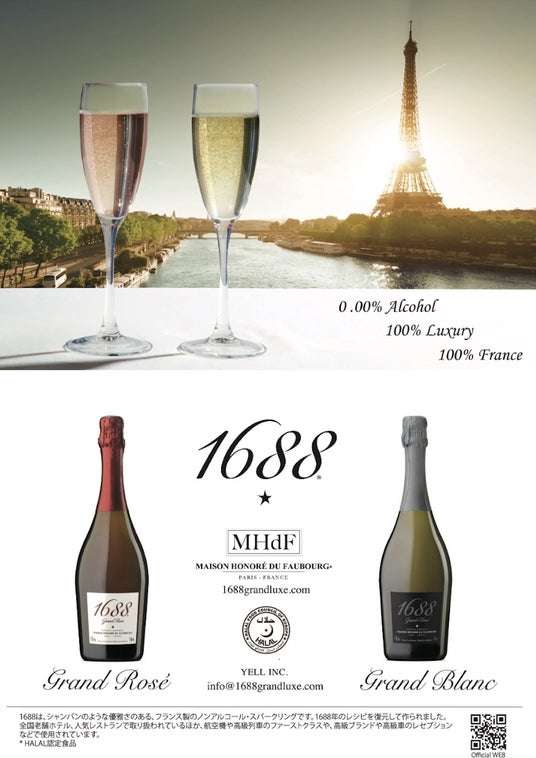 フランス製高級ノンアルコール・スパークリング ”1688 Grand Rose, 1688 Grand Blanc”の姉妹商品として2015年にデビュー。特に昨年のパリ五輪以来人気が加速している商品で、今年は某高級外国車の納車時のプレゼントにも採用されています。