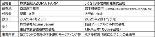 JR東日本は、株式会社Azumi Japanとの共同出資により、ホテルブランドの創設および、ホテル運営を行なう会社を設立し、あわせて、JR東日本グループの仙台ターミナルビル株式会社は、ホテル経営会社「JR STB小岩井開発株式会社」を設立致します。