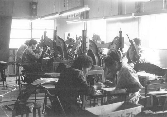 夜中、薄暗い工場の中で「蹴飛ばし(ケトバシ)」と呼ばれるフットプレス機を自ら動かして製品を作り、翌朝、羽田空港から飛行機に乗り、滋賀県に向かいました。