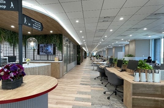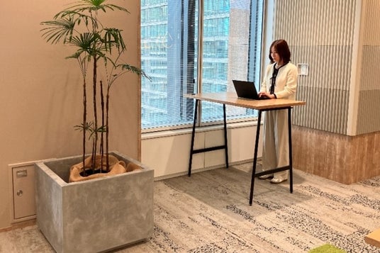 2024年1月に内幸町から丸の内にオフィスを移転し、成長を加速させるオフィス「Growth Accelerate Office」として、新たなオフィスでの活動をスタートしました。新たなオフィスでは、約75坪を増床し約600坪の広さとなりました。役職員のコミュニケーションの活性化やリフレッシュにつながる共用スペースを増やし、備品等を一か所に収納したグループ一体レイアウトとし、中央に執務室を配置し、その周りを周遊できるレイアウトで、役職員の歩行を促します。またスタンディングテーブルや、さまざまな動きにフィットしアクティブな姿勢になれる昇降スツールも導入しております。