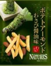商品特徴:わさび醤油のシーズニングで味付けをしたサクッと食感のポテトとアーモンドのミックスです。