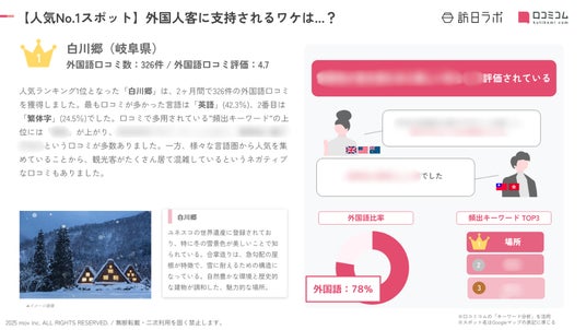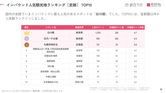 業界最大級のインバウンドビジネスメディア「訪日ラボ」及び 店舗向け集客一元化プラットフォーム「口コミコム」を運営する株式会社mov(代表取締役:渡邊 誠、本社:東京都渋谷区、以下mov)は、国内の史跡に寄せられた最新の口コミデータから、独自の『インバウンド人気観光地ランキング』を発表しました。