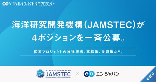 エン・ジャパン株式会社(本社:東京都新宿区、代表取締役社長:鈴木孝二)は、2025年2月6日(木)より、海洋研究開発機構(JAMSTEC)の『ソーシャルインパクト採用プロジェクト』(https://www.enjapan.com/)を開始しました。当社が運営する採用支援サービスを通じ、「国家プロジェクトの推進担当(変動海洋エコシステム高等研究所)」など全4職種を公募します。下記、本プロジェクト概要と海洋研究開発機構 採用担当のコメントを紹介します。