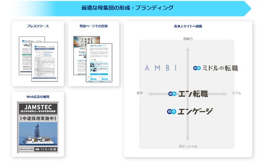 プレスリリースや特設ページ、Web広告での告知に加え、各求人サイトでの集客支援を実施。『エン転職』『エンゲージ』『AMBI』『ミドルの転職』とターゲットの異なる求人サイトを活用することで、ターゲットへ網羅的に求人を届けます。
