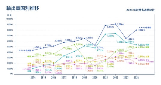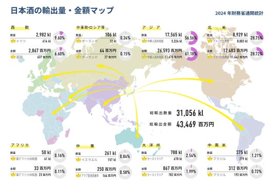 全国約1,600の酒蔵(日本酒、本格焼酎・泡盛、本みりん)が所属する日本酒造組合中央会(以下:中央会)は、2024年度(1月~12月)の日本酒輸出総額が434.7億円(昨対比:105.8%)、数量3.1?(昨対比:106.4%)となったことを発表します(2024年財務省通関統計)。