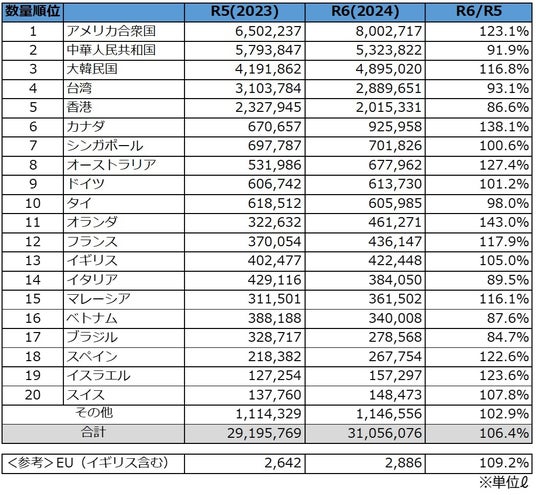 2024年度日本酒輸出数量国別TOP20