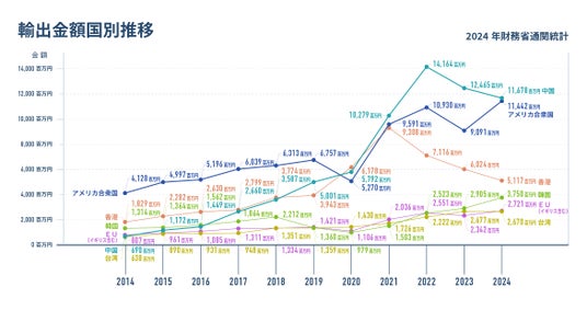 輸出金額1位は中国、輸出数量1位はアメリカ。韓国、EU(イギリス含む)などが増加。輸出相手国は過去最高の80ヵ国に。