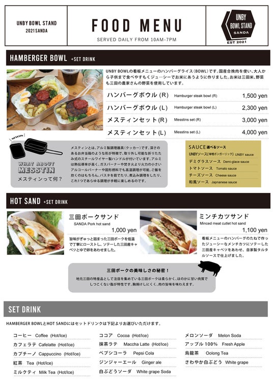 三田米・三田野菜を使ったハンバーグボウルや、三田ポークを使ったポークサンドなどのキャンプ飯を提供しています。