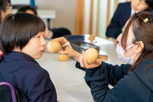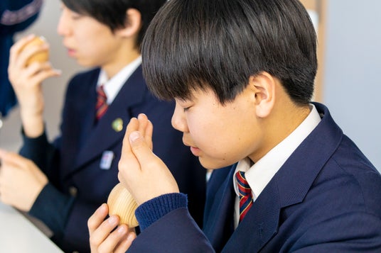 秋田県立比内支援学校中学部での授業は、2023年10月ぶり2度目の開催。前回は校庭に咲くバラ、今回は生徒たちがヤスリがけをした「杉のたまご」の香りを採用しました。主張の強いバラに比べて、秋田杉は控えめな淡い香り。その繊細な香りを、生徒たちは鋭い嗅覚と豊かな感性で見事に捉え、それぞれが自分だけの言葉で表現してくれました。「木々が静かに揺れる音が聞こえた」「冷たい風に吹かれながら海辺を歩いているような感覚」「花が咲き始める頃、やさしい風に撫でられて一匹のトラが目を覚ました」…など、生徒たちの豊かな創造力には驚かされるばかり。前回の授業に参加してくれた2・3年生の成長ぶりを垣間見ることもでき、とても素敵な再会の日となりました。