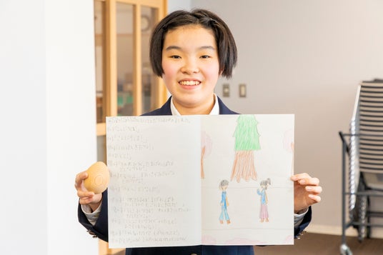 杉の香りから浮かんだのは、自然のなかの光景。足を痛めた私を、森で出会ったキツネが人間に化け、手当てをしてくれました。後に大館市が魔王とその軍に襲撃され、キツネが捕まってしまいます。恩返しのために闘った私は危うく負けそうになり絶望するのですが、比内支援学校の仲間が助けてくれて魔王を倒ことができました!