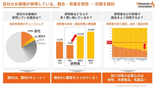 「CODE」で収集した購買データはID-POSとは異なり、第三者機関である弊社がユーザーから直接、購買データを収集しているため、どのチェーン・店舗で買ったか、どんなPB商品を買ったかなどの情報もご提供が可能です。そのため競合チェーンの売価の視察調査の代わりとしてご活用いただくことや、現地調査ではわからない、競合チェーンの売れ筋商品の分析も可能です。さらに、ひとりのユーザーの買い回りも分かるため、自社を利用しているお客様が、どの競合チェーンをよく利用し、そこで何を買っているかまで分析することが出来ます。