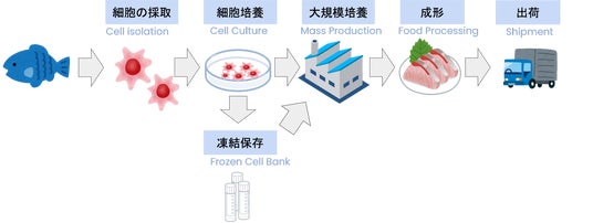 「細胞水産物」とは、魚介類の細胞に栄養を与えて細胞を育て増やすことで生産する水産品です。ビール工場のような大型タンクで細胞を増やし、可食部のみを生産します。細胞は凍らせて保存をすることができるため、将来的には魚・動物の命を奪うことなく、持続的な食料生産が可能になります。