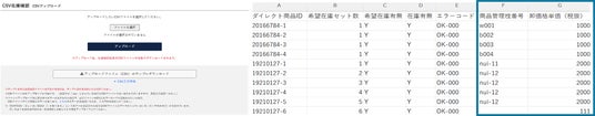 従来は「希望在庫有無」「在庫有無」「エラーコード」の情報が出力される仕様でしたが、この度の機能改善により「商品管理枝番号」と「卸価格単価」も新たに出力されるようになりました。