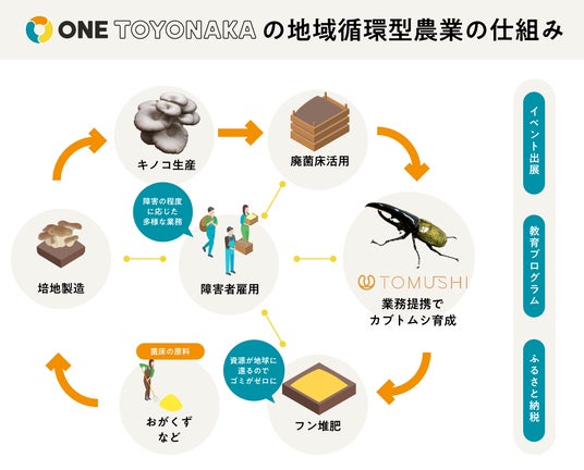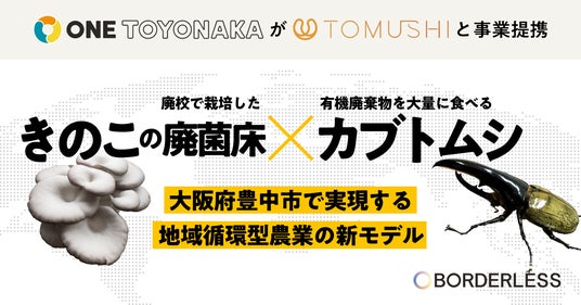 株式会社ボーダレス・ジャパン(本社:福岡県福岡市、代表取締役社長:田口 一成、以下「ボーダレス」)が運営する障害者の雇用創出を目的としたきのこ栽培事業「ONE TOYONAKA」(大阪府豊中市)は、 昆虫バイオスタートアップ「TOMUSHI」(本社:秋田県大館市、代表取締役CEO:石田 陽佑)と事業提携を開始したことをお知らせします。きのこ栽培の過程で発生する「廃菌床」をカブトムシの幼虫の餌として再利用し、カブトムシを生育・販売する新しい地域循環型農業モデルを実施します。本取り組みは、廃棄物を削減しながら昆虫飼育を通じたゼロ・ウェイストな循環型農業を推進することを目的としています。