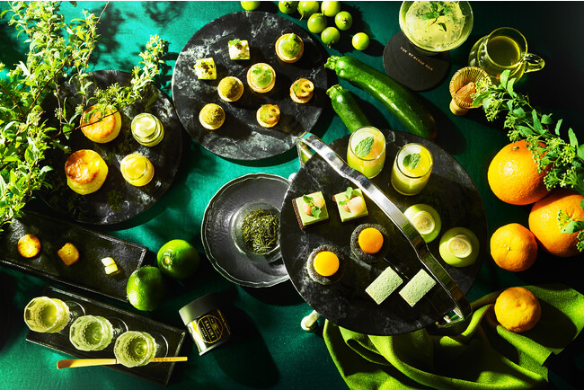 3段レイヤーにはグリーンカラーが鮮やかな5種のスイーツと4種のセイヴォリーが並びます。「ライムと甘夏のゼリー」、「ゆずとチェリーのムース」など、瑞々しく爽やかな柑橘類を使用したスイーツのほか、「抹茶とライチのタルト」や「一番茶の生チョコレート」といったお茶の爽やかな香り、旨味と甘味が凝縮されたスイーツが勢揃い。