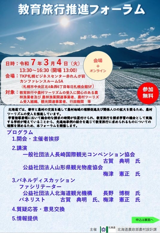 このたび、先進地事例の紹介を通じて教育旅行に関する理解を深めることを目的に「教育旅行推進フォーラム」を開催しますのでお知らせします。