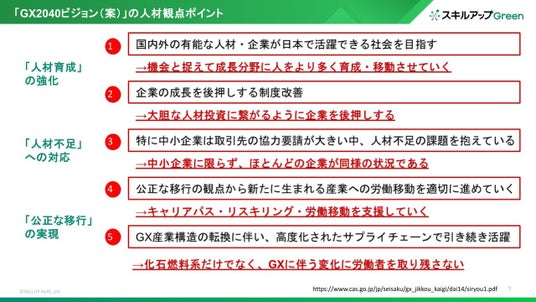 勉強会ではGX2040ビジョン(案)を人材の観点から「人材育成」の強化、「人材不足」への対応、「公正な移行」の実現の軸で5つポイントを解説しました。