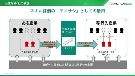 公正な移行の実現には政府や企業による支援が必要と考えられ、例えば、政府では各種助成・補助や制度優遇の実施、企業では学ぶ費用を補助したり学ぶ時間を労働時間に含める等の対応があげられます。そのような時にGXスキル標準が無いと対象や、支援と結果の関係が不明確となります。GXスキル標準により、評価と差分を明確にしたうえでスキルの習得を支援することが、適正な支援のあり方だと考えます。