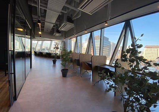 カフェのリラックスした空間とオフィスの快適な設備を兼ね備え、ガラス張りで開放感のあ