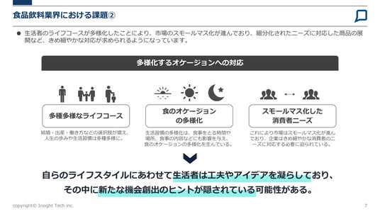 ◆食品飲料業界における特有の課題として、「食の安全・健康意識の高まり」「多様化するオケージョンへの対応」「商品開発サイクル/コミュニケーションサイクルの高速化」などが挙げられます。