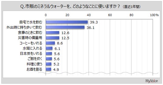 ミネラルウォーターの使用場面は(複数回答)、「自宅で水を飲む」が39.3%です。