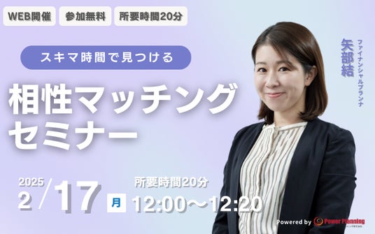 無料マネーセミナー提供サービス「アットセミナー」を運営しているパワープランニング株式会社が「2月17日(月) 12時」に「相性マッチングセミナー」というスキマ時間で自分に合ったFPを見つけられるオンラインセミナーを開催いたします。