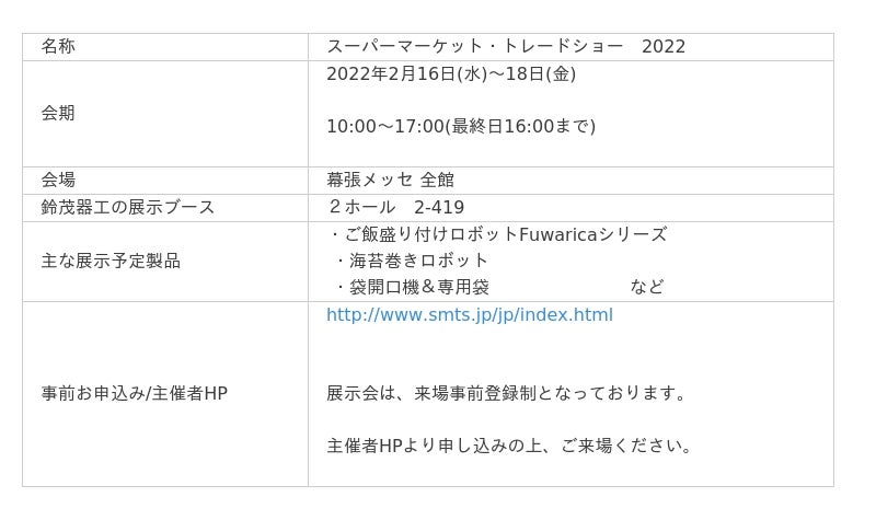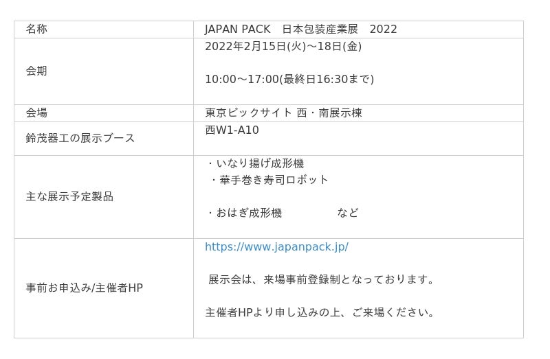 鈴茂器工株式会社(本社:東京都練馬区、代表取締役社長:鈴木美奈子、以下 鈴茂器工)は、2022年2月開催の国際ホテル・レストラン・ショー2022【2月15日(火)~18日(金)開催:東京ビックサイト】、JAPAN PACK 日本包装産業展 2022【2月15日(火)~18日(金)開催:東京ビックサイト】、スーパーマーケット・トレードショー2022【2月16日(水)~18日(金)開催:幕張メッセ】の3つの産業展示会に出展いたします。
