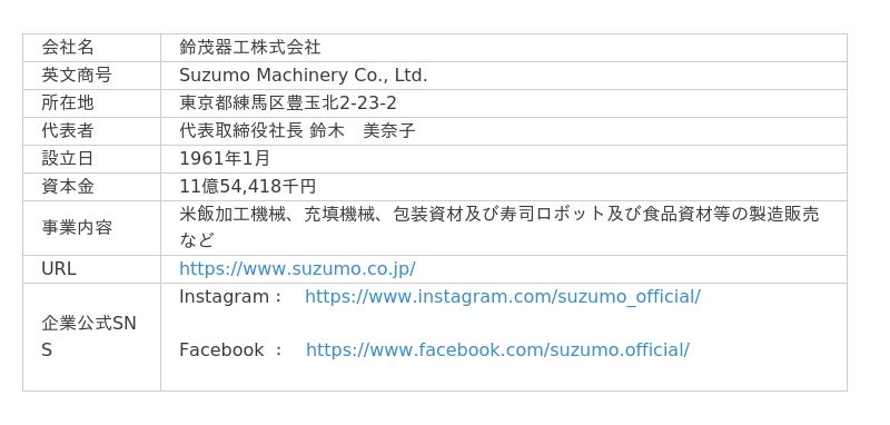 1981年に世界初の寿司ロボットを開発し、寿司の大衆化を実現し、現在世界シェアNo.1のリーディングカンパニーです。米飯加工ロボットにおいて国内外で高いシェアを占め、お寿司、おにぎり、丼ものなど、世界中の様々な食のシーンで幅広く利用されています。近年では、ご飯盛り付けロボット 「Fuwarica(ふわりか) GST-MRA」が、「第25回外食産業貢献賞(日本食糧新聞社主催)」を受賞するなど、業界でも注目を集めております。「食の「おいしい」や「温かい」を世界の人々へ」を掲げ、細分化する食に関するニーズをいち早く捉えて市場にご提案し、常に新しいフードビジネスを開拓する企業として躍進しています。