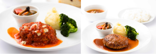 「スタンダードメニュー」のハンバーグと、成田シェフが全ての料理を監修した「コースメニュー」をシチュエーションにあわせてお選びいただけます。