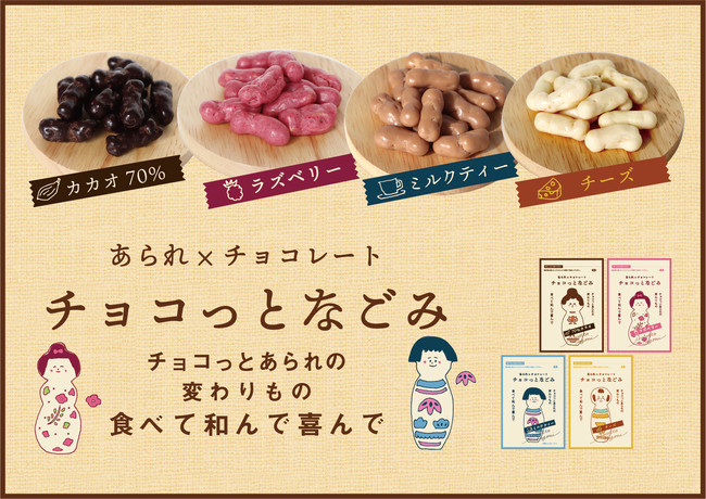 程よく塩気がきいた小粒のサクサクあられになめらかなチョコレートをコーティングした期間限定の人気商品「チョコっとあられ」の変わり種。三井アウトレットパーク北陸小矢部初登場です。こけしをモチーフに、味ごとに異なるキャラクターと物語のかわいらしいパッケージに仕上げました。70%カカオ・ラズベリー・ミルクティー風味に加え、 今年はチーズが仲間入り。 ぜひお気に入りを見つけてください。