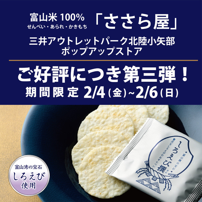 創業98年の老舗米菓メーカー日の出屋製菓産業株式会社(本社:富山県南砺市、代表取締役会長:川合 声一)が、三井アウトレットパーク北陸小矢部にて、日の出屋製菓産業の直営店ブランド「ささら屋」の期間限定ポップアップストア第三弾をオープンいたします。